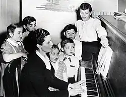 The new program ethered by WQXR, Come Dance Through the Ages, taught folk-dancing over the air. Friday 12 July 1940, at WQXR's classical salon on Fifth Avenue, girls from the Ethical Culture Summer Play School (Central Park West) "twirled and curtsied through a repertory of country dances, hornpipes and drop-the-handkerchiefs. At the other end of radio receivers, dance groups in less-privileged ends of town paced the same measures, following instruction given from the studio".[24] This series played each Friday on WQXR from 12 July through 16 August, teaching a selection of folk dances from the 15th century to the hot-cha of 1940. Music was interpreted by Mittelmann at the piano or via recordings, with oral explanations of the different dances given by Mittelmann, in collaboration with Sadie Gassen as dance director for the first program. The dances were instructed over the air, while actually being danced in the WQXR studio by groups of children.[25][26][27][28]