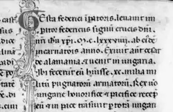 The Deeds did not circulate widely. It survives in two manuscripts.[1] In Paris, Bibliothèque nationale de France, MS lat. 4931, it takes up eight columns across three folios (105d–107c).[2] In both manuscripts, it is found alongside a longer text about Frederick, the Narration of the Oppression and Subjection of Lombardy, an account of the war with the Lombard League culminating in the battle of Legnano in 1176. This was written shortly after the treaty of Venice in 1177.[1] Ronald Witt suggests that the two may have been written by the same person.[3] Both these texts together were adapted several times by later Italian writers.[1]