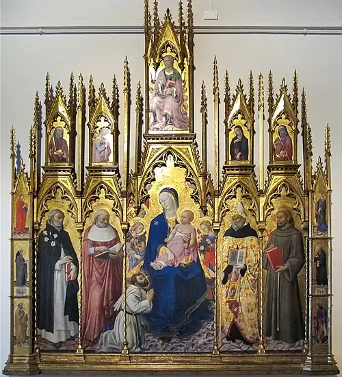 The main panel shows the Madonna and Child enthroned flanked by six angels, with Blessed Giovanni Colombini (founder of the Jesuati order) kneeling in prayer before them. Beside it are four panels with full length figures of Saint Dominic, Saint Jerome, Augustine of Hippo and Francis of Assisi. Down the outer left-hand edge are three panels showing (from bottom to top) saints Peter, Anthony Abbot and Mary Magdalene, with an equivalent set down the right-hand edge James the Great, Ephrem the Syrian and Catherine of Alexandria.[3]