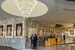 The four-star Gevora Hotel is entered through the lobby on the first floor.[10] The lobby is decorated using marble and gold-colored elements.[17] The Guinness World Records plaque stating that Gevora Hotel is the tallest hotel is displayed in the lobby as well.[18] The 528 rooms are located above the lobby.[11] The smallest rooms are the 232 double rooms with a size of 500 sq ft (46 m2).[10][19] Larger are the one-bedroom suites, of which there are 264, with their size of 670 sq ft (62 m2).[20][21] The 32 suites with two bedrooms occupy 910 sq ft (85 m2) each.[10][21]