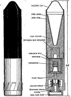 The Gewehr-Panzergranate was launched from a Gewehrgranatengerät or Schiessbecher ("shooting cup") on a standard service rifle by a blank cartridge. The primary components were a nose cap, internal steel cone, steel upper body, aluminum lower body, rifled driving band, TNT filling, and a PETN base fuze.[1]