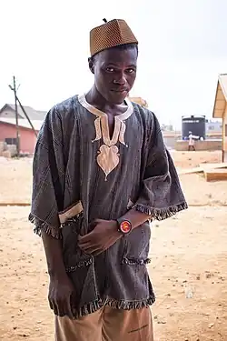 The Ghanaian Smock or Tani is a fabric worn by both women and men in Ghana.[1] It is the most popular traditional attire in the country. The fabric is called Tani in Dagbani, while the male and female wear are respectively called Bin'gmaa and Bin'mangli. The smock is formally worn with a hat (zipligu)/ scarf (bobga), footwear (muɣri), and a trouser (kurugu).[2]