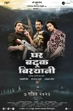 Ghar Banduk Biryani (transl. Home, Gun, Biryani), abbreviated as GBB, is a 2023 Indian Marathi-language action comedy film directed by Hemant Jangal Awtade in his directorial debut, starring Akash Thosar, Sayaji Shinde, Nagraj Manjule, and Sayli Patil in the lead roles. It was jointly produced by Zee Studios and Aatpat Production.[4] The film centres on Pallam, the leader of an who insurgency in the fictional town of Kolagad, where Raju meets Lakshmi. Lakshmi's father insists Raju has a house, but he can't comply. Meanwhile, Inspector Raya Patil's duty in Pune causes issues, leading to his transfer to Kolagad.[5]