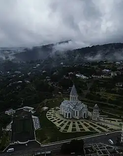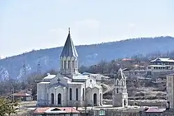 Holy Savior Cathedral (Armenian: Սուրբ Ամենափրկիչ մայր տաճար, Surb Amenap′rkich mayr tachar), commonly referred to as Ghazanchetsots (Armenian: Ղազանչեցոց),[a] is an Armenian Apostolic cathedral in Shusha in Azerbaijan. It is the cathedra of the Diocese of Artsakh of the Armenian Apostolic Church. Standing 35 metres (115 ft) high, Ghazanchetsots is one of the largest Armenian churches in the world. A landmark of Shusha and the Karabakh region,[4] and of Armenian cultural and religious identity,[5] it was listed as a cultural and historical monument of the former breakaway Republic of Artsakh.