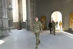 Azerbaijan's Defense Ministry officially denied it was behind the attack,[62] while its state news agency claimed the missiles came from the Armenian side.[63] Azerbaijan's President Ilham Aliyev later stated: "We need to investigate this issue... We have doubts that could have been done by Armenians in order to blame us. If it was done by Azerbaijani military units, that was a mistake, and we don’t have any historical or religious targets..."[64] In an interview with BBC, Aliyev stated: "the images of that church which I have seen, show that it is very minor damage. And this damage can be repaired within maximum two weeks."[65] Almost two years after the war, Aliyev's advisor Hikmet Hajiyev said that the church "sustained collateral damage" during the war.[66]