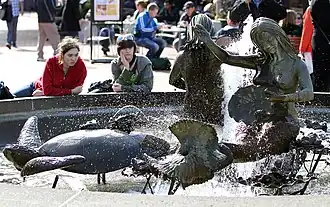 The cast bronze statue[11] in Ghirardelli Plaza, titled Andrea, was installed by San Francisco sculptor Ruth Asawa in 1968.[12] It features two mermaids, one of whom is nursing a merbaby, surrounded by frogs and turtles. The statue was designed to delight viewers in the wonders of the ocean and to create a connection between the square and the nearby bay. The fountain was met with condemnation from American landscape architect Lawrence Halprin who found the piece unserious and demanded its removal.[13] Many San Franciscans, especially women residents, rallied around Asawa in support of keeping the sculpture.[14]