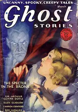 Fantasy and occult fiction had often appeared in popular magazines prior to the twentieth century, but the first magazine to specialize in the genre, Weird Tales, did not appear until 1923.[1] Ghost Stories, which was launched by Bernarr Macfadden in July 1926, is one of Weird Tales' earliest competitors.[1] Macfadden also published true confession magazines such as True Story; Ghost Stories followed this format, with the contents mostly produced by the publisher's staff writers, and attributed in print to a first-person narrator. The magazine was initially printed on slick paper, which was sufficiently good quality to allow photographs to be used, and many of the stories had accompanying photographs purporting to be of their protagonists. These were replaced by line drawings when the magazine was switched to pulp paper in July 1928. Ghost Stories occasionally printed contributions from outside writers, including "The Apparition in the Prize Ring", by Robert E. Howard, under the pseudonym "John Taverel". Popular writers such as Frank Belknap Long, Hugh B. Cave, Victor Rousseau, Stuart Palmer, and Robert W. Sneddon all sold stories to Ghost Stories, though the quality suffered because of the limited scope the magazine's formula gave them. Carl Jacobi's first published story, "The Haunted Ring", appeared in the final issue.[2][3][note 1]