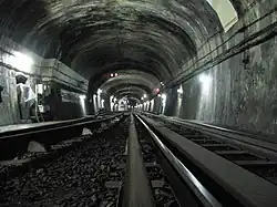 A special tunnel, the voie des Fêtes, links the Place des Fêtes to the Porte des Lilas with an intermediary station called Haxo, constructed in 1921.[4] This tunnel was intended to connect lines 3 and 7 (now 3bis and 7bis). The tunnel was never used as it was decided to run a shuttle service between the stations of each of these lines. This shuttle proved unpopular with passengers and service stopped in 1939. Haxo has never been used for passenger transport, and there is no street-level access. However, there is a proposal to merge lines 3bis and 7bis into a new line, which could mean that the station will be completed and opened to the public.[5]