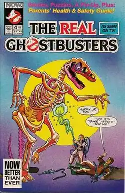 ![]() Peter Venkman and Ray Stanz of the Ghostbusters battle a ghostly animated Tyrannosaurus skeleton. From The Real Ghostbusters Vol.2 #4. From NOW Comics. | |