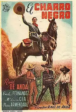 The Charro Negro is a ghost of Mexican folklore that, according to popular traditions, is described as a tall man, with an elegant appearance, in an impeccable black suit consisting of a short jacket, a shirt, tight pants and a wide-brimmed hat who wanders in the depth of the night in the streets of Mexico on the back of a huge jet-colored horse.[15] He is of Mexican origin, and is related to the Devil. It has also served as Mexican cultural inspiration for literature and cinema such as La Leyenda del Charro Negro.[16]