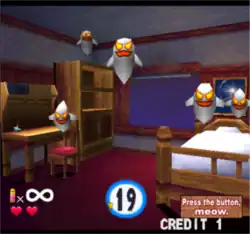 Ghoul Panic is a light gun shooting video game, often compared to the Point Blank series which also runs on the same arcade hardware. Players use lightguns attached to the arcade cabinet to fire at enemies in a series of minigames.[2][3] These minigames feature a quota that must be fulfilled before the time limit ends, such as shooting a certain number of enemies or protecting small, yellow cats from projectiles.[3] Completing minigames will allow the player to progress, while losing will cause the player to lose a life; losing all lives will result in a Game Over.[3] A life will also be lost if the player shoots the yellow cats or "bomb ghosts".[3] The game is divided into three different stages, each featuring eight minigames to play that become gradually harder as it progresses.[2] Finishing all the minigames in a stage will have the player face off against a boss, including: Frankie, a Frankenstein's monster that will toss projectiles at the player; Vladie, a vampire that launches a barrage of deadly bats; Witchina, a witch that attacks with her spell-casting broomstick; and Mama Mia, a massive dragon-like monster that hurls fireballs.[3]