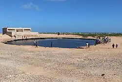 Another pool is located just south of the main road, bypassing the village. It is a brackish and muddy, salty sinkhole of larger dimensions, 120 m x 90 m around, but barely 2 m deep. On the shallow, surrounding ledges, the villagers have built small salt evaporation pans for salt winning.[2] This water pool is also dubbed Socotra Crater, as some scholars maintain that it is meteoric in origin.[3] However, this theory has proven controversial.[4]
