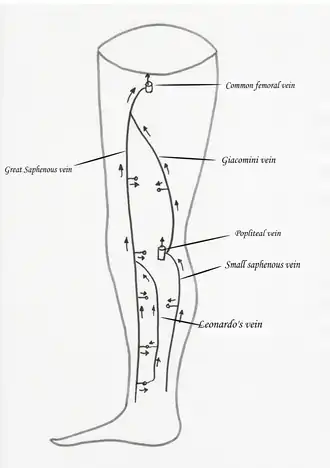 - ^ Pourandokht Khodabakhsh, Konstantinos T. Delis; Alison L. Knaggs (December 2004). "Prevalence, anatomic patterns, valvular competence, and clinical significance of the Giacomini vein". Journal of Vascular Surgery. 40 (6): 1174–1183. doi:10.1016/j.jvs.2004.09.019. PMID 15622372.