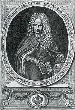 Gian Antonio Lazier was born in the Italian village of Perloz, near Aosta. He was born on 9 June 1678 according to late 18th-century sources, though his birth date is not attested by any known contemporary sources.[1] His father's name was Francesco Lazier and his mother's name was Giacobina Neiroz.[1][c] In addition to the common rendition Gian Antonio, Lazier sometimes spelled his name as Gianantonio, merging the two first names into one,[23][24] or rendered it in French as Jean Antoine.[25] Though Lazier later claimed that his last name (sometimes alternatively spelled in the French variants dell'Ales or L'Asie) derived from the Byzantine name Laskaris (the ruling dynasty from 1204 to 1261), there is no evidence that either of his parents had any clear connections to former Byzantine royalty. Given Lazier's detailed knowledge of the Angelo Flavio Comneno family it is possible that there was some form of relation and that he claimed Byzantine ancestry through them. Perhaps Lazier was a relative or descendant of Marco Lazier, who had married Maria Altadonna Angeli, a cousin of Giovanni Andrea II, some decades prior to Lazier's birth.[1] In reference to his humble origins Lazier has sometimes been nicknamed "the peasant who wanted to become emperor".[26]
