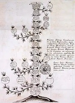 In 1724, Lazier claimed to have also been recognized by Maximilian II Emanuel, Elector of Bavaria. Lazier however never provided details or a specific date concerning this recognition and it is possible that it either never happened or that it was less formal than his recognition by the emperor.[1] The first appointment to the Constantinian Order by Lazier was the Italian abbot Lorenzo Virgilio de Nicolis, appointed on 6 April 1720. In return for his appointment, Nicolis wrote and published a book in support of Lazier.[1][32] In 1721, Lazier published invented genealogies in Regensburg, Bavaria, documenting his supposed Byzantine descent.[1] His genealogies were backed up by an extensive number of forged diplomas and documents which served to indicate recognition of various invented ancestors by past popes and Holy Roman emperors.[33] Lazier's recognition by Charles, his genealogies, and the book published by Nicolis increased Lazier's standing and influence.[34] That Lazier attracted more widespread support as a result of these events can be gathered from the diversity among his appointees and the great number of decrees issued in 1722–1723. Many of the individuals appointed by Lazier were descendants or members of aristocratic families from the Balkans.[35]