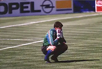 After taking part in the 1990 World Cup without playing a minute, Pagliuca overtook Walter Zenga, Stefano Tacconi and Luca Marchegiani, becoming first choice goalkeeper for Italy at the 1994 World Cup under Arrigo Sacchi. He received the dubious honour of being the first goalkeeper to be sent off in a World Cup match, when he was dismissed for handling outside his area against Norway.[18] However, he returned after suspension to feature from the quarter-finals onwards with his team losing the final to Brazil in a penalty shootout. Despite the loss, Pagliuca became the first ever goalkeeper to save a penalty from a shootout in a World Cup final, denying Márcio Santos his shot.[19]