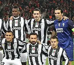 On 11 August 2012, Buffon lifted his first trophy as the new Juventus captain, following Alessandro Del Piero's departure as Juventus defeated Napoli 4–2 in the 2012 Supercoppa Italiana.[85] Buffon suffered a minor injury and missed the first Serie A match of the 2012–13 season.[86] He returned to the starting line-up on 2 September as team captain.[87] He was nominated for the 2012 FIFA Ballon d'Or and the 2012 UEFA Team of the Year for his performances throughout the calendar year.[88] He obtained his first Champions League clean sheet on 7 November against Nordsjælland[89] and kept clean sheets against Chelsea[90] and Shakhtar Donetsk, the latter of which was on Buffon's 100th club appearance in European competitions.[91] Buffon kept a clean sheet in a Coppa Italia win against Cagliari on 12 December.[92] Buffon was voted second in the IFFHS World's Best Goalkeeper award, behind Iker Casillas, and named goalkeeper of the century by the same organisation.[93][94]