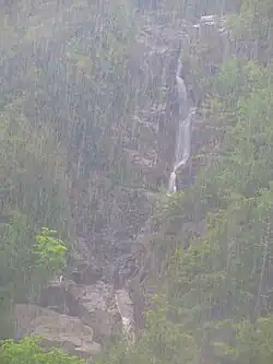 Five trails ascend Giant Mountain. The two western approaches are the most popular and begin on trailheads along New York State Route 73, one near St. Huberts ("Roaring Brook Trail") and the other near Chapel Pond ("Ridge Trail"). Due to their popularity with hikers and the number of cars exceeding available space in the summer months, parking on the shoulder of Route 73 was banned in 2019.[6] The two trails climb the southern ridge of the mountain, merging 0.8 miles (1.3 km) south of the summit.[6] The Ridge Trail is slightly shorter than the Roaring Brook Trail but steeper, ascending 3,050 feet (930 m) over the course of 3.2 miles (5.1 km). It passes by a large pond known as Giants Washbowl 0.8 miles (1.3 km) from the trailhead. Alternatively, the Roaring Brook Trail ascends 3,375 feet (1,029 m) to the summit over 3.6 miles (5.8 km). There is a junction 0.5 miles (0.80 km) from the trailhead of Roaring Brook Trail for a side trail to Roaring Brook Falls.[6]
