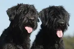 The first Giant Schnauzers emerged from Swabia in the German state of Bavaria, and Württemberg in the 17th century.[7] These dogs were considered a rough-coated version of the German Pinscher breeds, and their hair was thought to help them withstand the harsh German winters and bites from vermin.[1] The origins of the breed are unclear, but sources speculate possible ancestors include black Great Danes,[1] German Shepherds,[1] Rottweilers,[1] Dobermanns,[1] Boxers,[1] Bouvier des Flandres,[1] Thuringian Shepherds,[2] and the Standard Schnauzer.[2]