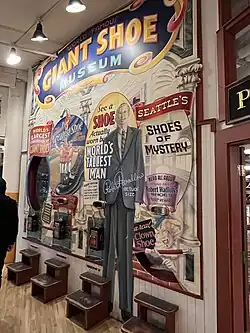 Cody Permenter included the museum in Thrillist's 2015 list of "The 11 Strangest Museums in (and Around) Seattle".[10] Christina Ausley of the Seattle Post-Intelligencer included the Giant Shoe Museum in a 2020 overview of the city's 14 "strangest" landmarks, writing: "Drop a humble 50 cents into a small coin box for the world's largest collection of giant shoes. Nestled a few floors below downtown Seattle's Pike Place Market, approach the flamboyant circus entryway and gaze through the binoculars for a myriad of Herculean hi-tops and a size 37 work by Robert Wadlow."[11]