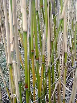 Miscanthus × giganteus, also known as the giant miscanthus, is a sterile hybrid of Miscanthus sinensis and Miscanthus sacchariflorus.[b] It is a perennial grass with bamboo-like stems that can grow to heights of 3–4 metres (13 ft) in one season (from the third season onwards).[c] Just like Pennisetum purpureum, Arundo donax and Saccharum ravennae, it is also called elephant grass.