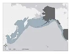 E. dofleini migration patterns vary depending on the population. In the eastern Pacific waters off the coast of Japan, migration coincides with seasonal temperature changes in the winter and summer. Here, E. dofleini migrate to shallower waters in the early summer and winter and offshore in the late summer and winter.[27] There is no evidence of these migration patterns in the Alaskan and northeast Pacific populations of E. dofleini.