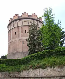 Construction of the "Rotonda" building, located at the corner of Via Citolo da Perugina, was begun on 21 September 1923. It was planned for dual functions: first as an elevated water tank and second, as to house in its base a chapel commemorating certain refugees killed in the recent world war. Its round shape resembles the Ancient Roman Tomb of Caecilia Metella in Rome.