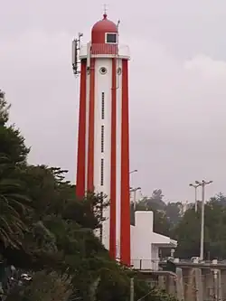 The Gibalta Lighthouse (Portuguese: Farol da Gibalta) is an active Portuguese lighthouse located at Oeiras, about 10 km west of the centre of Lisbon.[1] [2] It is a white cylindrical tower with dome and red veins, with illumination being supplied by a red fluorescent light. It was rebuilt in 1954 following a landslide which destroyed the old light and killed ten people on a passing train.[3][4]