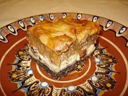 From the basic recipe, many local specialties have evolved. Prekmurska gibanica, for example, is a "fancy" multi-layered cake from Prekmurje in Slovenia, served as a dessert course on festive occasions.[9] Međimurska gibanica, from the neighbouring Međimurje region of Croatia, is a closely related but simpler and less "formal" dish consisting of four layers of fillings (prepared fresh cheese (quark), poppyseed, apple and walnut).[10] Another gibanica variety, called Prleška gibanica, is known from Prlekija to the west of the Mur River.[11]