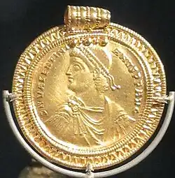 Two patterns are present: a floral and a cruciform.[52] The 30 mm diameter coin shows an imperial bust and the inscription "DN VAL".[53] Given the long space for the figure's title, this is a Valentinian.[54] The name Valentinian is not specified, and we don't know if it refers to Valentinian I,[47] Valentinian II, or Valentinian III, as these emperors reigned from 364 to 455.[26] Christian Pilet opts for Valentinian I. The imperial bust is adorned with a diadem of two rows of pearls and a drapery.[54][53]