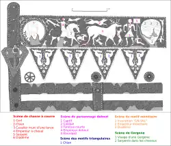 The frame of the work shows a hunting scene. It depicts a hunt with a stag (a dix-cors) surrounded by four vertagus or vertragus breed dogs, "prized for their speed," as described by Arrien,[61] with a rider carrying a spear. Wearing a cuirass and a diadem floating in the wind, this rider is identified as the emperor.[49] This depiction of the emperor hunting is common, even though deer hunting is only of interest in the Late Roman Empire.[62] Thus, stag hunting is one of the elements used to date the work.[63]