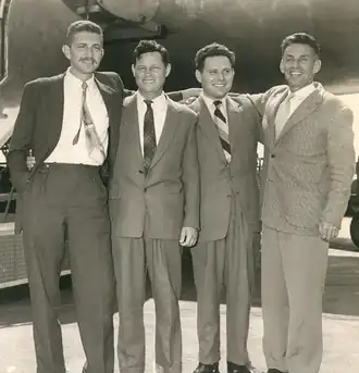 ![]() A delegation of four officers sent by David Ben Gurion to collect funds in the United States in 1956. From left to right: Ezer Weizmann, Yossi Harel, Nachman Karni, and Gideon Shohat. | |