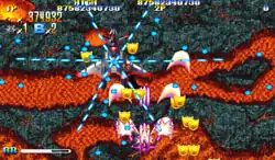 The player chooses one of four different craft and shoots through seven stages. Each level ends with a boss fight and each game begins with three lives. The option to continue is given when all lives are lost, although the seventh stage is only accessible if the player does not use any continues. Each ship in Giga Wing has three attacks: a normal shot (spray of bullets), reflect (reflects enemy bullets and damages enemy ships in the field), and force bomb (nullifies all on-screen bullets). Defeated ships sometimes drop power-ups. Each ship starts out with two bombs and up to seven can be collected. Each bomb left in reserve after any boss fight gives the player a bonus. Players can increase their score multiplier by collecting medals dropped by defeated ships. Player "rank" is determined by score at the end of each level. The game adjusts the difficulty accordingly.
