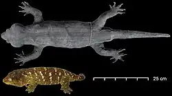Gigarcanum delcourti is 50% longer and was likely several times heavier than the largest living gecko, the also New Caledonian Rhacodactylus leachianus,[6] with a snout-to-vent length (SVL, which measures from the tip of the snout to the back edge of the reproductive and defecatory cloacal opening) of 37 cm (14.6 in) and an overall length (including tail) of at least 60 cm (23.6 in).[2] The body is robust, and the tail is tapering, cylindrical and weakly annulated. The skull is large, and makes up about 20% of the SVL. The digits bear claws, and are weakly-moderately webbed. The digit pads are rectangular and broad.[6] The body colour is yellowish-brown, with dark reddish-brown stripes running along the length of the upper body.[7]