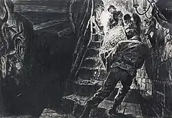 Duotone image of a burning Zeppelin for Stag magazine, January 1960 -