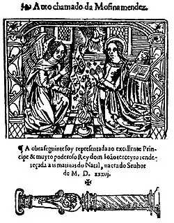 In 1493, he was acting as master of rhetoric to the Duke of Beja, afterwards King Manuel, a post which gave him admission to the court.[8] His first known work, O Monólogo do vaqueiro ("Monologue of the Cowherd"), was written in Spanish and acted in the rooms of Maria of Aragon, wife of King Manuel, to celebrate the birth of Prince John (later John III of Portugal). The first performance, recited by the playwright himself, took place on the night of 8 June 1502, in the presence of the king; the queen; Leonor of Viseu, former Queen of Portugal and widow of John II; and Beatriz of Portugal, mother of the King.