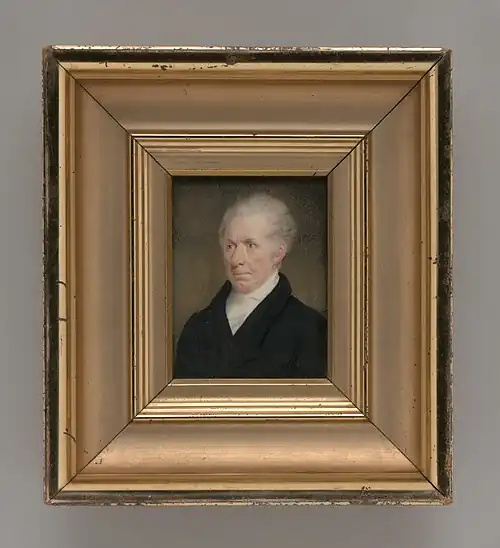 Sarah Goodridge was a miniature portrait painter, who studied with noted American painter Gilbert Stuart. In 1825, he commissioned a portrait from her.[2] This miniature is in the Smithsonian American Art Museum.[3] The portrait bust faces obliquely left. It was described by family as "the most lifelike of anything ever painted of him in this country".[2]
