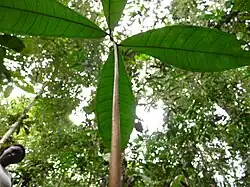 The seeds of this tree are eaten by various mammals including rodents, pigs, duikers, African buffaloes, elephants, gorillas and humans.[6] The seeds are spread when the pods split explosively. The tree casts dense shade and this suppresses herbs and undergrowth on the forest floor, but is tolerated by the tree's own seedlings and saplings to the exclusion of other species. However, the pure stands of this tree are very sensitive to habitat disturbance; the felling of trees allows more light to reach the forest floor and the seedlings of G. dewevrei are outperformed by those of other, faster growing species of tree.[5]
