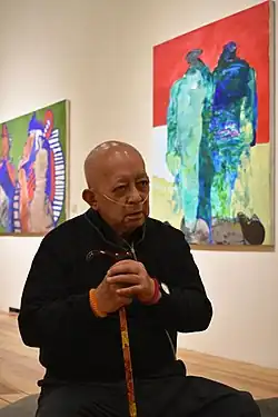 His first exhibition was called "Energía" at the Galería Nuevas Generaciones at La Esmeralda which was well received.[6] He has had over 200 individual exhibitions of his work since his first in 1954, with participation in over 300 collective shows.[4][6] Every year since 1970, he has had multiple exhibitions mostly in Mexico but abroad as well.[6] His work has frequently been shown at locations in Mexico City such as the Salón de la Plástica Mexicana (of which he is a member), Galeria del Aeropuerto Internacional, the Museo de la Estampa, Museo Carrillo Gil, Museo de Arte Moderno, the various galleries of the Escuela Nacional de Artes Plásticas and at the Palacio de Bellas Artes.[7] Other places in Mexico where his work has been shown include the Museo Contemporáneo in Toluca, the gallery of the University of Sinaloa, Galería Juan Cabrera in Puebla, Instituto Regional de Bellas Artes in Aguascalientes and San Luis Potosí. Galeria Miro in Monterrey, Galeria Migritte in Guadalajara, Instituto Cultural Cabañas in Guadalajara, Museo de Arte Moderno in Toluca, Museo Biblioteca Pape in Coahuila, Arte Actual Mexicano in Monterrey, ITESM Campus Estado de México and the Instituto Chiapaneco de Cultura. Outside of Mexico, his work has been exhibited 1958 Pan American Union meeting in Washington, D.C., the Brooklyn Museum, La Joya Gallery in Los Angeles, Bienal Latinoamericana in São Paulo Brazil, Casa de las Américas in Havana, Museo de Arte Contemporáneo at the University of Chile, the Museo de Bellas Artes in Bogota, Colombia and the Museo de Artes Plásticas y Visuales in Montevideo, Uruguay, IBM Gallery in New York, Sagacho Exhibit Space in Tokyo, Pabellón de las Artes, Expo-Sevilla Spain, Hamburische Landesbank in Hamburg, Norddeutsche Landesbank in Hanover.[5] In 2008 there was a retrospective with over 400 of his works at the Palacio de Bellas Artes.[7]