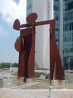 Aceves Navarro has created monumental works such as murals and sculpture. He has painted twelve murals located in Mexico City, Querétaro, Guadalajara, Veracruz, Montreal, Atlanta and Recife.[4] In 1970 he painted the work Yo canto a Vietnam, an acrylic mural at the Mexico Pavilion at the World's Fair in Osaka, Japan. In 1982 he created a mural called Apoteosis de Manuel Tolsá y musa románticas made of wood, metal, tezontle and glass at the Escuela Nacional de Artes Plásticas. In 1993, he created a mural called Una canción para Atlanta in latex and acrylic for the 1996 Summer Olympics for the Atlanta Olympic Committee. In 1996 he created a mural called La guerra y la Paz at the intersection of Avenida J. Antonio Alzate and Avenida Santa Maria La Ribera in Mexico City. In 2006 he created a sculpture called La fuente de la vida which was installed on Paseo de la Reforma.[5] On 10 April 2010, it was unveiled a new steel sculpture in Parque Tecnologico, a business venue located within Tec de Monterrey College campus Queretaro.[8]