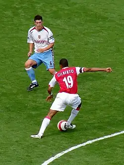 As a result of his World Cup performances, Gilberto garnered a move to the Premier League to sign for Arsenal that summer for a fee of £4.5 million.[5] During his six years at Arsenal, Gilberto gained a reputation as a world class defensive midfielder, and starred in a midfield duo alongside Patrick Vieira.[6] He would feature as a member of the Invincibles, where he captured his first top-flight league title as his team went undefeated the whole season, as well as winning two FA Cups. Gilberto also holds distinct records at Arsenal, recording their first goal at the Emirates Stadium,[7] as well as their fastest ever goal, scoring in 21 seconds from kickoff against PSV Eindhoven in the 2002–03 UEFA Champions League.[8] After departing Arsenal, Gilberto relocated to Greece, playing for Panathinaikos, where he won a domestic double. He then returned to Brazil in 2011, signing for Grêmio, where he remained for two years, before returning to Atlético to win the 2013 Copa Libertadores prior to retiring.
