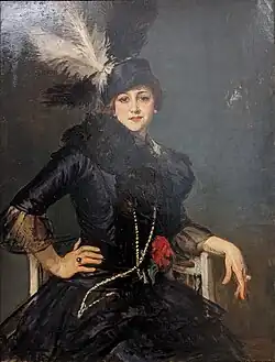 Darthy was an actress on the Paris stage.[2][3] She wore costumes by Paquin[4] and Redfern,[5] and was a popular subject of fashion reporting,[6] photography and postcards, with her red hair often featured. Jacques-Émile Blanche painted a portrait of Darthy, hand on hip, wearing a hat with multiple large plumes. In 1910, she was announced as a passenger on a flight from Algiers to Timbuktu, to help publicize a new French air service across the Sahara Desert.[7]