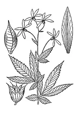 Gillenia (syn. Porteranthus) is a genus of two species of perennial herbs in the family Rosaceae, Gillenia stipulata and Gillenia trifoliata. Common names for plants in this genus include: Bowman's root, Indian-physic, American ipecac. This genus is endemic to dry open woods with acidic soils in eastern North America. Both plants are subshrubs with exposed semi-woody branches and serrated leaves; the larger lower leaves are divided into palmately arranged leaflets. Plants bloom in May, June, or July; blooms are composed of five slender white petals which are loosely arranged and typically appear slightly twisted and limp as if they were wilted. The flowers mature into small capsules. G. stipulata and G. trifoliata are often planted as ornamentals[1] and used in herbal medicine.[2][3][4]