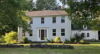 Further down, on the left at 210 Gilman Road, is the Captain Reuben Prince House. Built around 1817,[4][10] some thirty years before the town's incorporation, it was originally the home of Reuben Prince (1792–1870), a sea captain,[11] who lived there with his wife, Deborah Drinkwater (1794–1878). They were the parents of neighbor Samuel. Prince was listed as one of the owners of the schooner Boston,[12] which was built in Yarmouth Harbor in 1842 and registered, firstly in Portland and Falmouth, Maine, in 1850, then in Machias, in 1856.[13] The home, which sits on 9.2 acres,[10] contains some architectural work undertaken by John Calvin Stevens. Upon Reuben's death in 1870, the home passed to his youngest son, Harlan Prince, who was also a sea captain and, upon retiring from the seas in 1892, became a member of the Maine House of Representatives.[14] It remained in the Prince family until Harlan's death.[4]