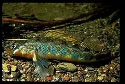 The gilt darter (Percina evides) is a species of freshwater ray-finned fish, a darter from the subfamily Etheostomatinae, part of the family Percidae, which also contains the perches, ruffes and pikeperches. It can be found in a number of states in the Mississippi River drainage of the United States although it has been extirpated from some river systems in which it was at one time present, mostly due to siltation and pollution problems. Males are more colorful than females and can grow to a length of about 9 cm (3.5 in). It is a benthic fish that feeds primarily on small aquatic insect larvae. Males form territories during the breeding season in late spring and early summer. Spawning typically takes place at the upper ends of riffles with sandy and gravelly bottoms interspersed with larger cobbles. Some organisations are endeavouring to conserve populations of the gilt darter and re-introduce it to states where the fish has been extirpated but suitable habitat still exists.