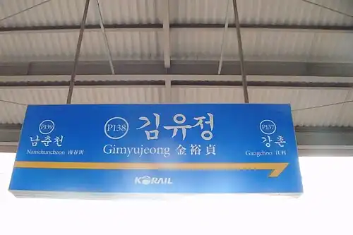 Gimyujeong station (formerly Sinnam station) is a railway station of the Gyeongchun Line in Sindong-myeon, Chuncheon-si, Gangwon-do, South Korea. It is named after the Korean novelist Kim You-jeong.[1]