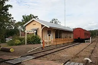 From 1 November 1960 the Mount Perry railway was closed beyond Tirroan, due to declining revenue. The railway beyond Tirroan was dismantled in 1961. After the transfer of sugar cane traffic from the Watawa plantation area in 1964, to the Gin Gin Central Sugar Mill at Wallaville there was little traffic beyond Gin Gin other than stock specials to the cattle loading railhead at Tirroan. The section of line from Tirroan to Mount Perry was closed in 1960 and removed in 1961, due to declining traffic revenues. The Gin Gin to Tirroan section was closed in 1989. The final section of the Bundaberg Railway, beyond the Versatile Toft siding (North Bundaberg to Gin Gin), closed officially to traffic on 25 January 1993, although services had been suspended in 1991. The line was sold for removal, with rail being sold off to local sugar mills for use on their tram networks. Part of the former right-of-way has been adapted for use by the Bingera Mill for its sugar tramway. The Gin Gin station complex was leased to the Gin Gin and District Historical Society in 1993, following closure of the railway. The complex was purchased by the Kolan Shire Council in 1995 for the use of the Historical Society. Other buildings have been transported on to the site by the Gin Gin and District Historical Society including a school house, and police residence, barn and indigenous museum (housed within the former goods shed). The additional buildings have not been relocated to the immediate vicinity of the former railway yard, and as a result do not detract from the visual appeal of the railway complex Within the former station yard the trackwork, turnouts and roads have been retained extant. Donated items from Queensland Railways including a BBV guards van, camp wagon, and a flat wagon and water gin, which have been placed on the platform road at the station building, and other roads within the complex. At the Tirroan end of the complex a former Gin Gin Central Sugar Mill tramway 0-6-0 steam locomotive has been placed on display on a dual-gauge 1,067-and-670-millimetre (42.0 and 26.4 in) track.[1]