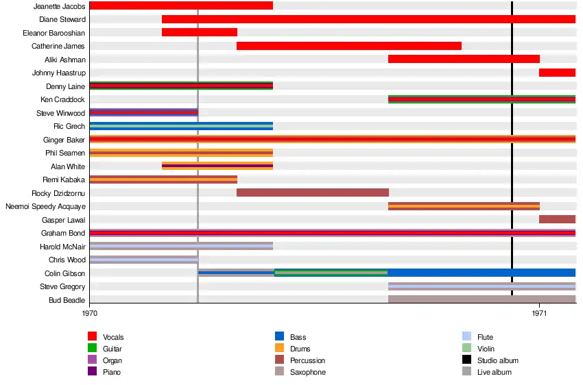 | Past members | Ginger Baker Graham Bond Steve Winwood Chris Wood Denny Laine Ric Grech Remi Kabaka Phil Seamen Harold McNair Jeanette Jacobs Alan White Eleanor Barooshian Colin Gibson Diane Stewart Bud Beadle Kenneth Craddock Steve Gregory Aliki Ashman Rocky Dzidzornu Neemoi "Speedy" Acquaye Catherine James Gasper Lawal Johnny Haastrup |