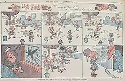Ginger Meggs, created in 1921 by Jimmy Bancks, is one of Australia's most popular and the longest-running comic strip. The strip follows the escapades of a red-haired prepubescent mischief-maker who lives in an inner suburban working-class household. While employed at The Bulletin, Bancks submitted cartoons to the Sydney Sunday Sun, where he began his Us Fellers strip in 1921 in the "Sunbeams" section of the Sunday Sun. Ginger first appeared in Us Fellers on 13 November 1921, drawn by Bancks.[3] When Bancks died on 1 July 1952 from a heart attack, Ron Vivian took over the strip (1953–1973), followed by Lloyd Piper (1973–1982), James Kemsley (1983–2007), and Jason Chatfield since 2007. In 2023, it was announced that the series would be discontinued.[4][5]