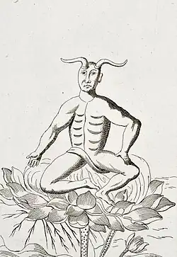 The description in Shinnaiden is prominent. In China, he was influenced by Taoism, and in Japan, he further merged with Susanoo, the Kami of Shinto. This is because both Gozu Tenno and Susanoo were considered to be plague gods.[7] He was considered to be the Buddha Bhaisajyaguru.[1]